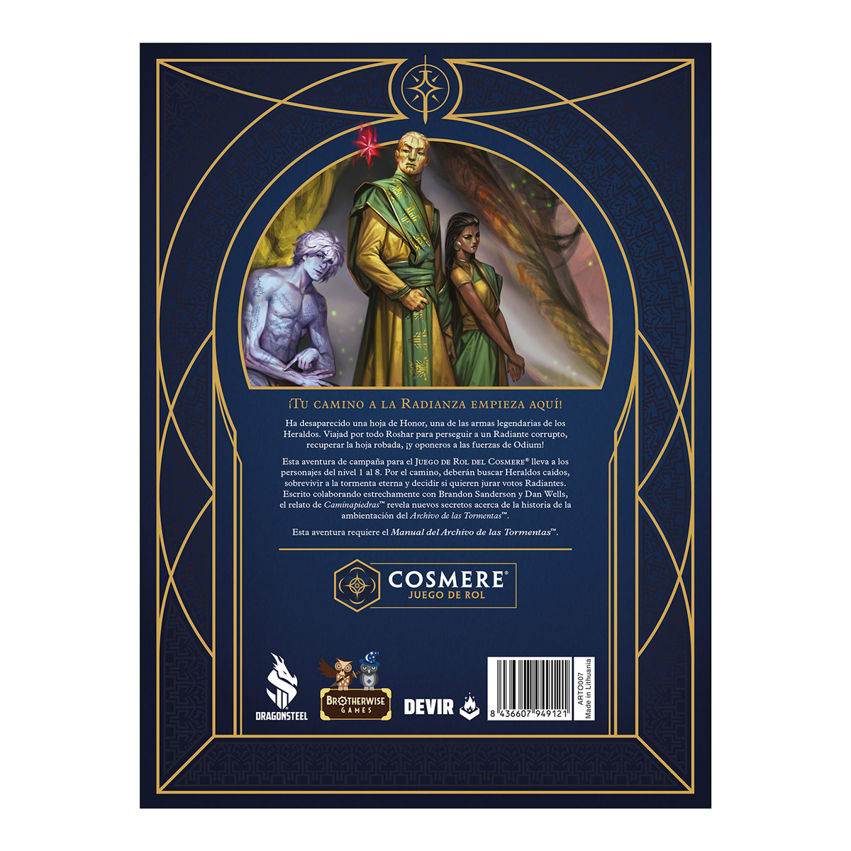 Esta campaña para el juego de rol de Cosmere® llevará a los personajes desde nivel 1 a nivel 8. A lo largo del camino, los personajes deberán buscar a Heraldos caídos, sobrevivir a la tormenta eterna y elegir si harán sus juramentos Radiantes. Creada junto a Brandon Sanderson y Dan Wells, la historia de Caminapiedras™ revela nuevos secretos sobre la ambientación de El Archivo de las Tormentas™.
