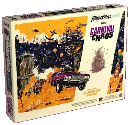 Thunder Road Vendetta: Carnival of Chaos es una expansión para el juego de mesa Thunder Road que te ofrece una nueva forma de jugar con la que ampliar la emoción y la diversión. Los jugadores corren con sus autos hacia la arena, recolectando obsequios, poderosas superarmas y chatarra mientras luchan por sobrevivir.